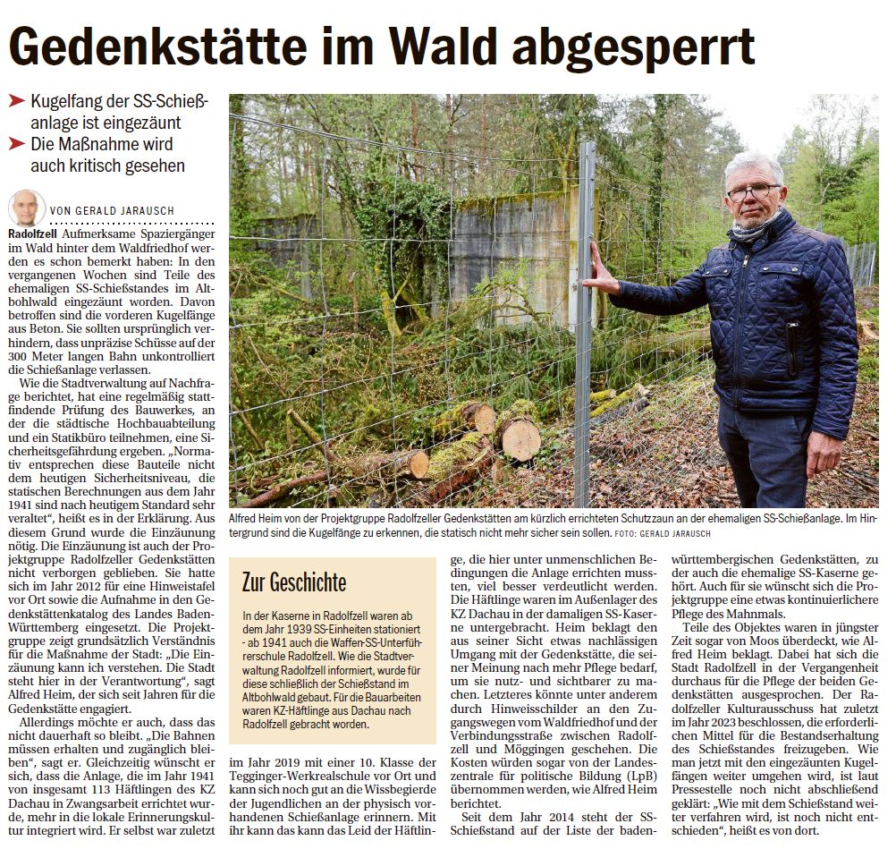 Veröffentlicht am 15. April 202622. April 202614.04.2026 – SÜDKURIER – Online-Bericht Gedenkstätte abgesperrt: Ein Teil der SS-Schießanlage wurde eingezäunt